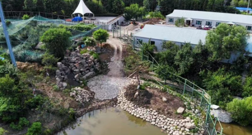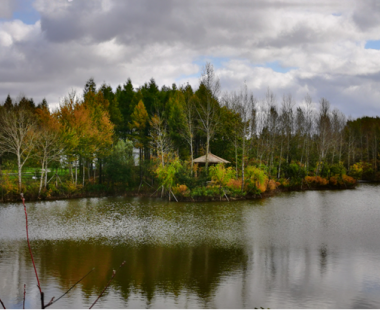 湖边凉亭,给你最佳的观景体验,自八年前放的鱼苗,四处可以看到密布的水泡(鱼在水下呼吸),大鱼不时从湖面腾跃而出,又跌回水里。