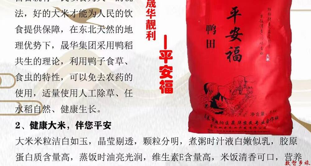 长春晟华农业科技发展集团有限公司成立于2018年6月,注册资金5000万,固定资产6000多万元,年加工大米7000吨,主营东北农特产品年销售收入4366万元,采用“党支部+公司+合作社+市场+社员”的生产经营模式,与农户建立稳定的合作制度,集团2021年流转托管的土地面积达20000多公顷,直接带动农户1120户,每农户增收2200多元,年安排剩余劳动力300人。晟华良田采用饮马河一级水源保护区灌溉生态种植大米,生态绿色,稻鸭共作技术,人工除草,大米含有富硒元素,消费者吃的健康,是企事业单位团购送礼的选择。