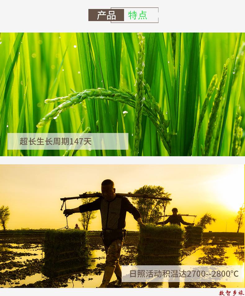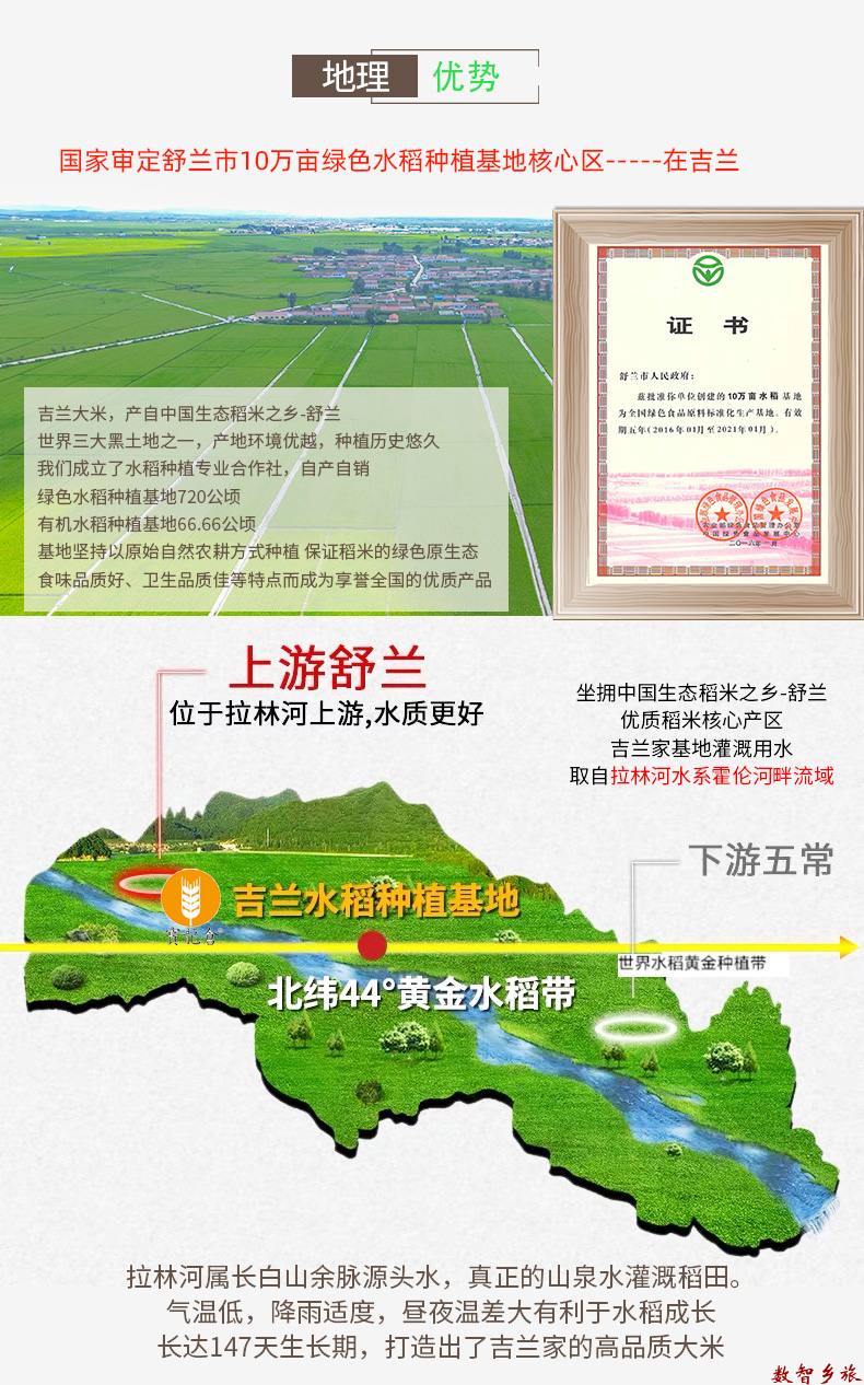 纯正稻花香2号,绿色种植,手工收割,天然晾晒, 自然成熟,舒兰地标产品,自有基地种植,不对外采 购原粮,把控原粮品质,执行绿色食品标准,采用双 层真空包装,锁鲜工艺,追求品质生活就可以买它。 包装上带有舒兰大米地标,绿色食品标识,执行绿色 食品标准,原产地舒兰发货。